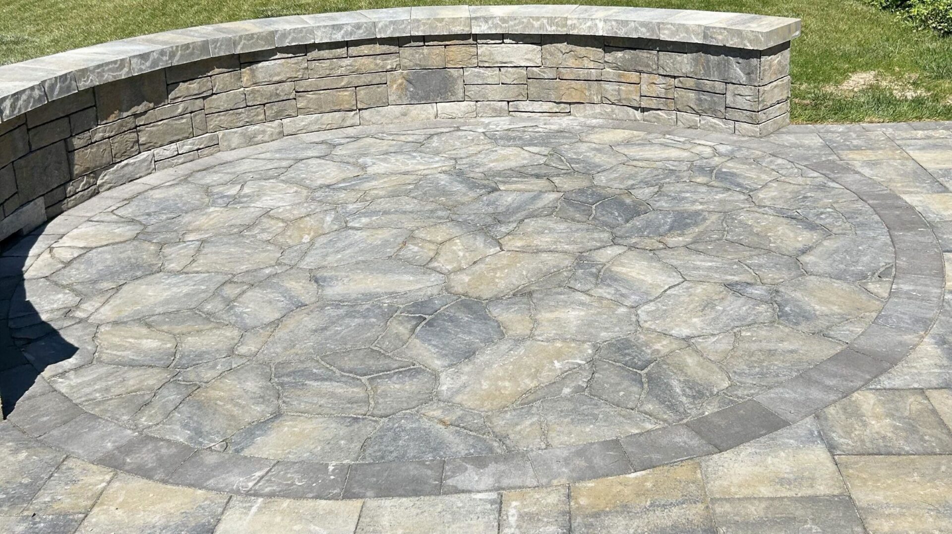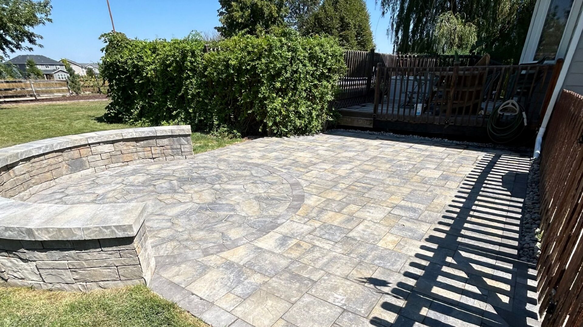 Transform lawn areas into a custom paver patio with a seating wall and fire pit, install connecting walkways, and reduce front yard sod to support a water-efficient, drought-friendly landscape.